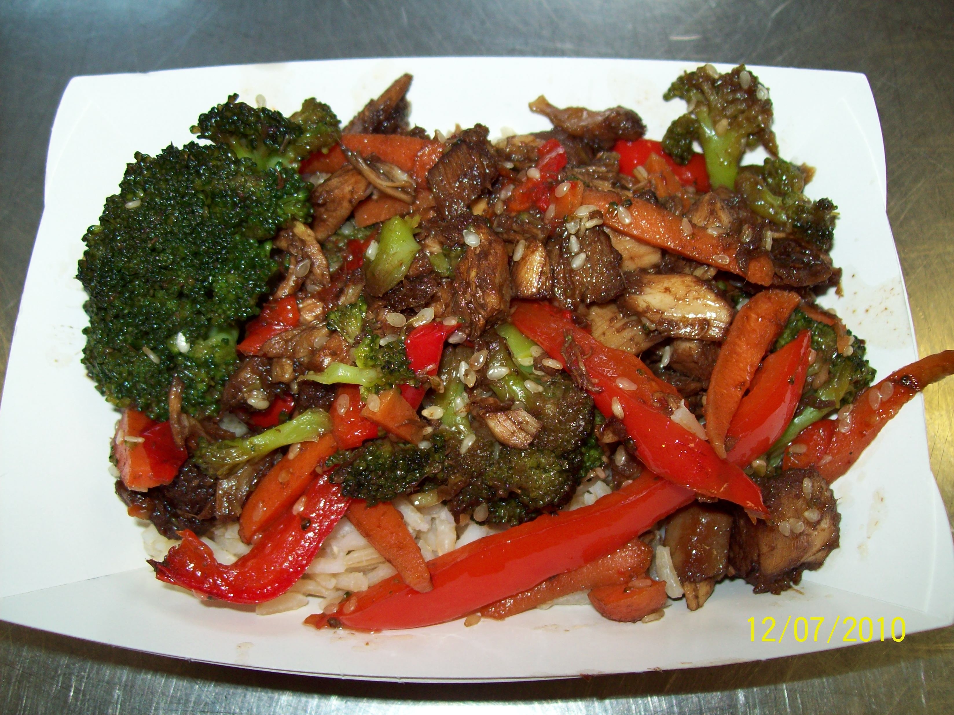 Serve ½ cup rice on platter and top with chicken/sautéed vegetables using a 4 oz spoodle.