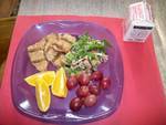 Crispy salad of cabbage, carrots, red peppers, green onions and sugar snow peas marinated in sesame ginger dressing with brown rice and fresh romaine lettuce.