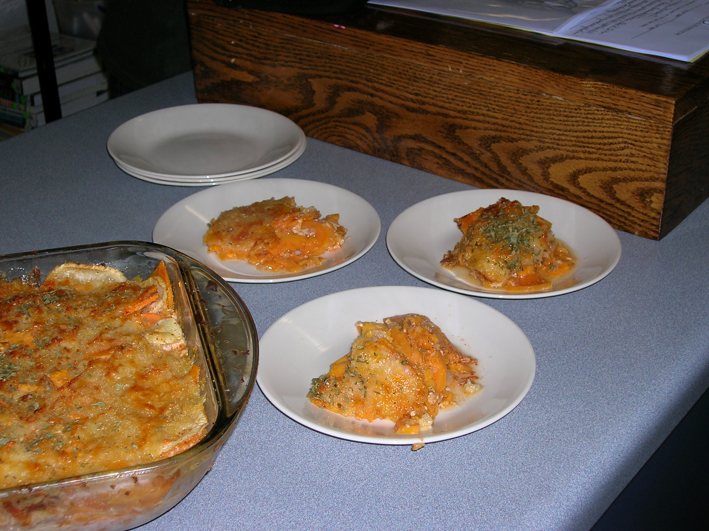 For 50: Spray one 4 inch deep, full size cake pan with pan spray. Layer half of cooled sweet potatoes alternately with turnip slices across bottom of pan. Top with half of the sauce. Repeat with remaining vegetables and top with remaining sauce. For 6: use a 9x13 baking dish. Sprinkle bread crumbs and remaining cheeses over top of casserole.