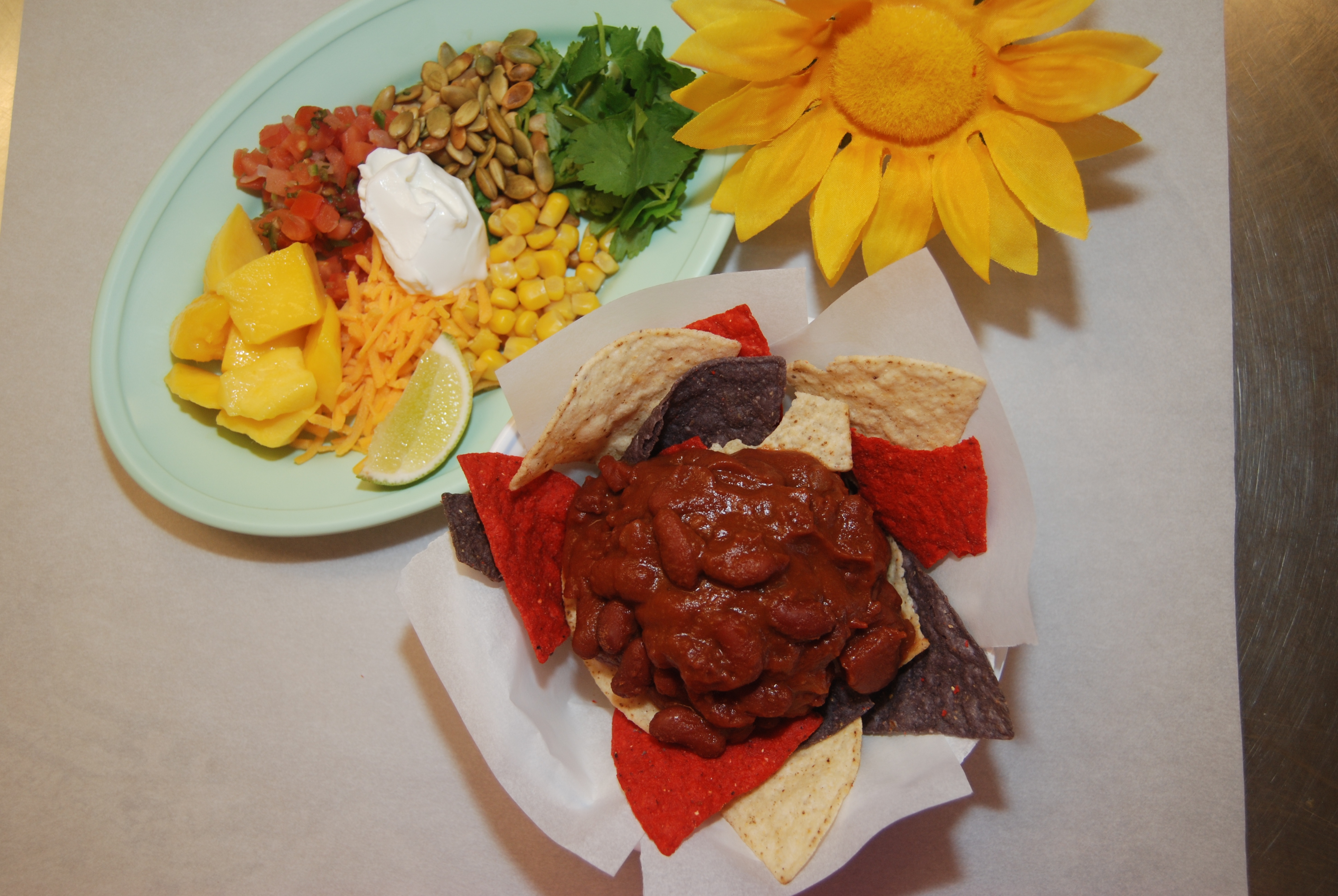 Portion #6 scoop (appr 5.5 oz) chili over chips.