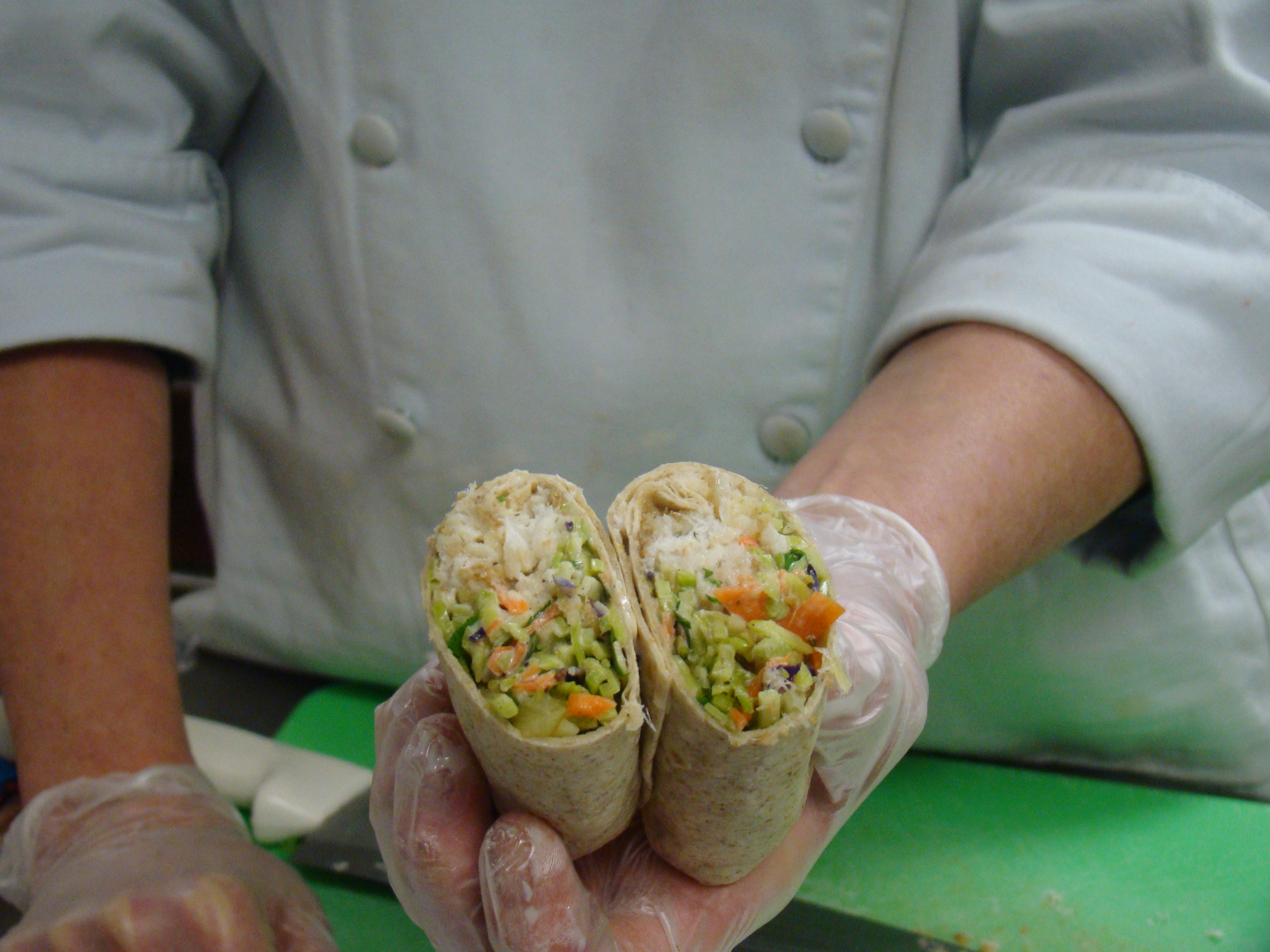 Mix together broccoli slaw, drained pineapple, spinach, (chopped). Scoop 1/2 cup broccoli/spinach mixture onto wheat wrap. Place 3 oz chicken, then 1 tablespoon dressing on top. Wrap into buritto style wrap. Cut on diagonal. CCP: Hold at 40 degrees or lower for cold service.