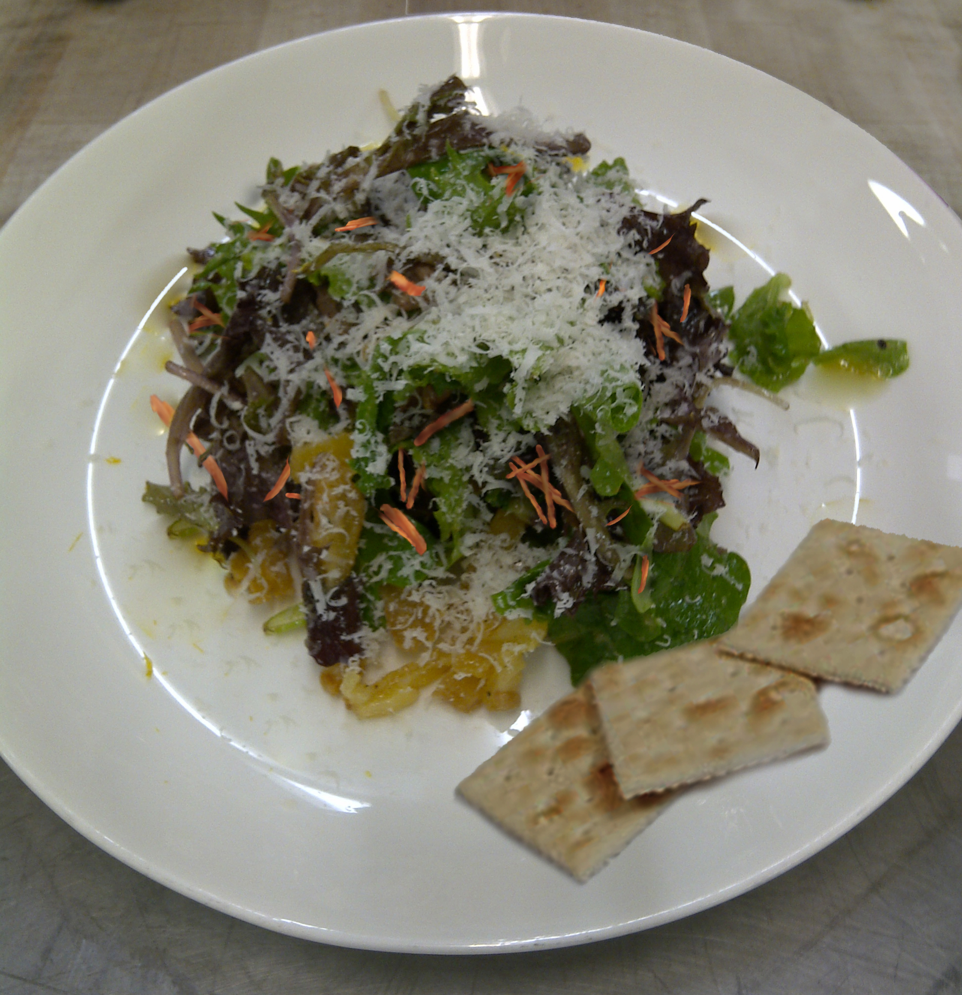 Put mixed greens in large mixing bowl, drizzle dressing over greens and mix together. Add remaining chopped plumped pear, walnuts and grated carrots and toss lightly. Portion out 1 cup of salad and top with 1/2 TBLSP grated aged cheese. Serve with packet of 3 whole wheat saltines.