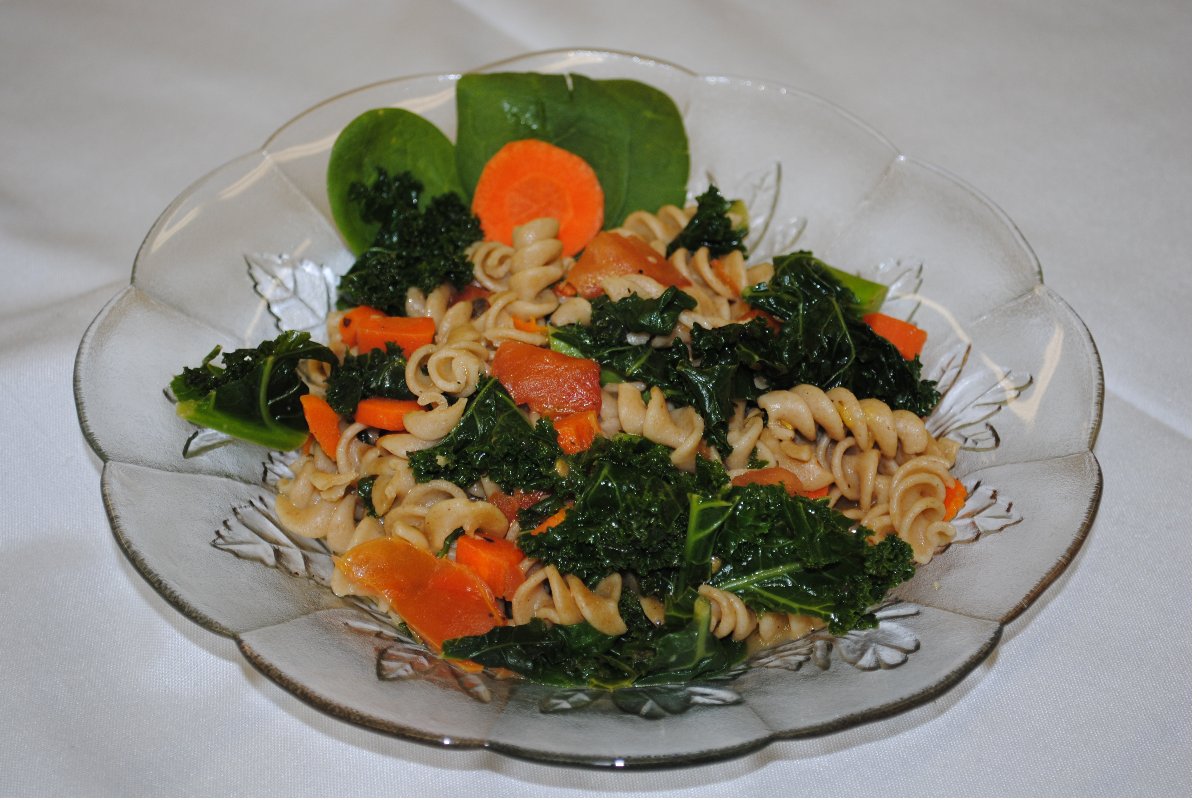 Try this colorful, nutrient rich pasta side dish. Eat the colors of the rainbow with fresh red pepper, carrots, kale, and spinach. Rotini noodles capture the flavor of seasonings and the veggies add both sweet and savory taste sensations. Served warm, it has loads of fresh veggies, tastes good and is good for you.