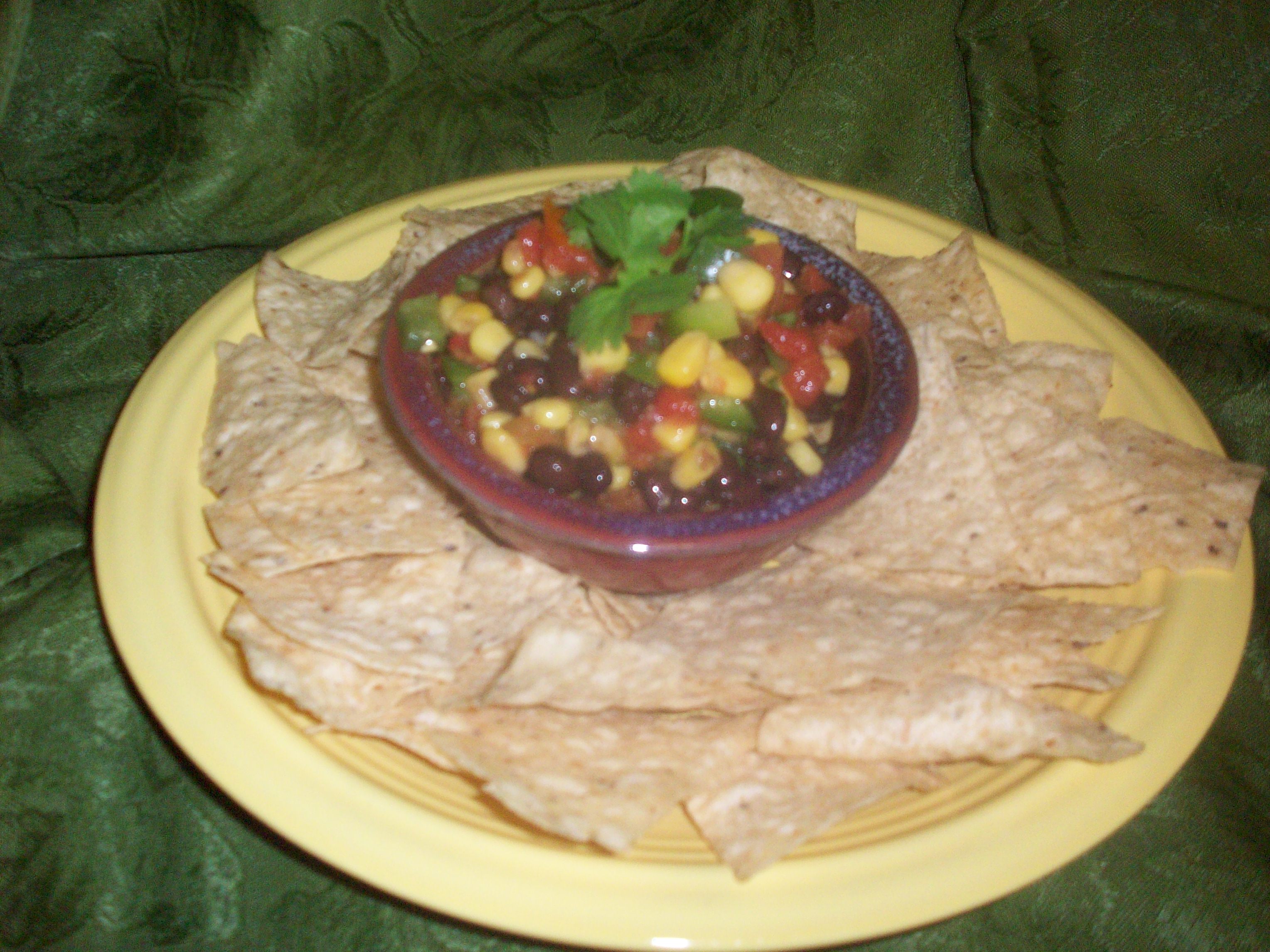Zesty and colorful. Pleasing to the eye and the taste buds. Juicy diced tomatoes, yellow corn, black beans, and green pepper all mixed together with fresh cilantro and Italian dressing then served with baked tortilla chips create an appetizing, healthful side dish.