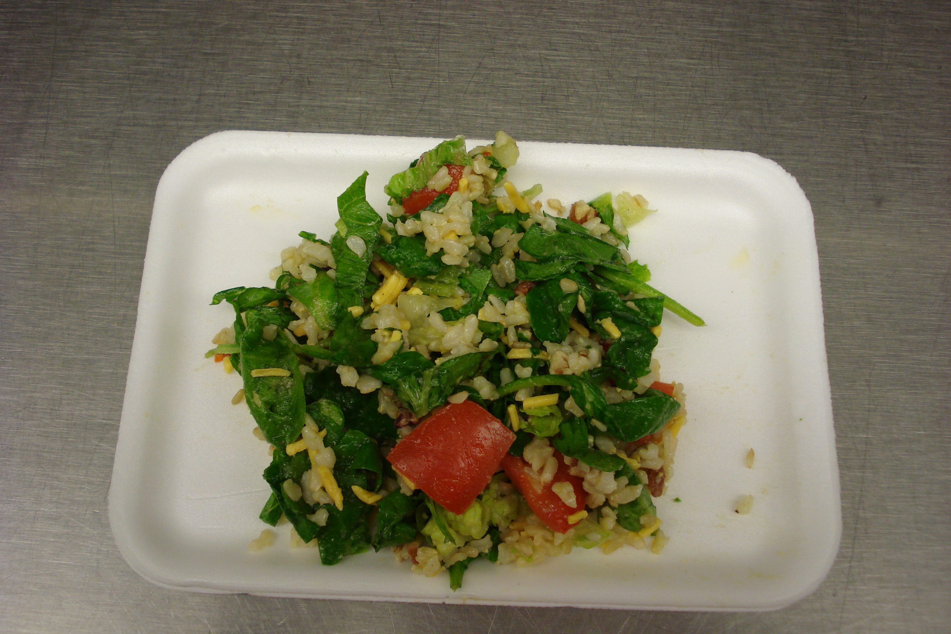 The Roasted Italian Salad is a combination of fresh Romaine lettuce, spinach leaves, roasted nuts (pecans were used in our recipe), chopped tomatoes, and brown rice all tossed in a Fat Free Italian Dressing. This is a side dish.
