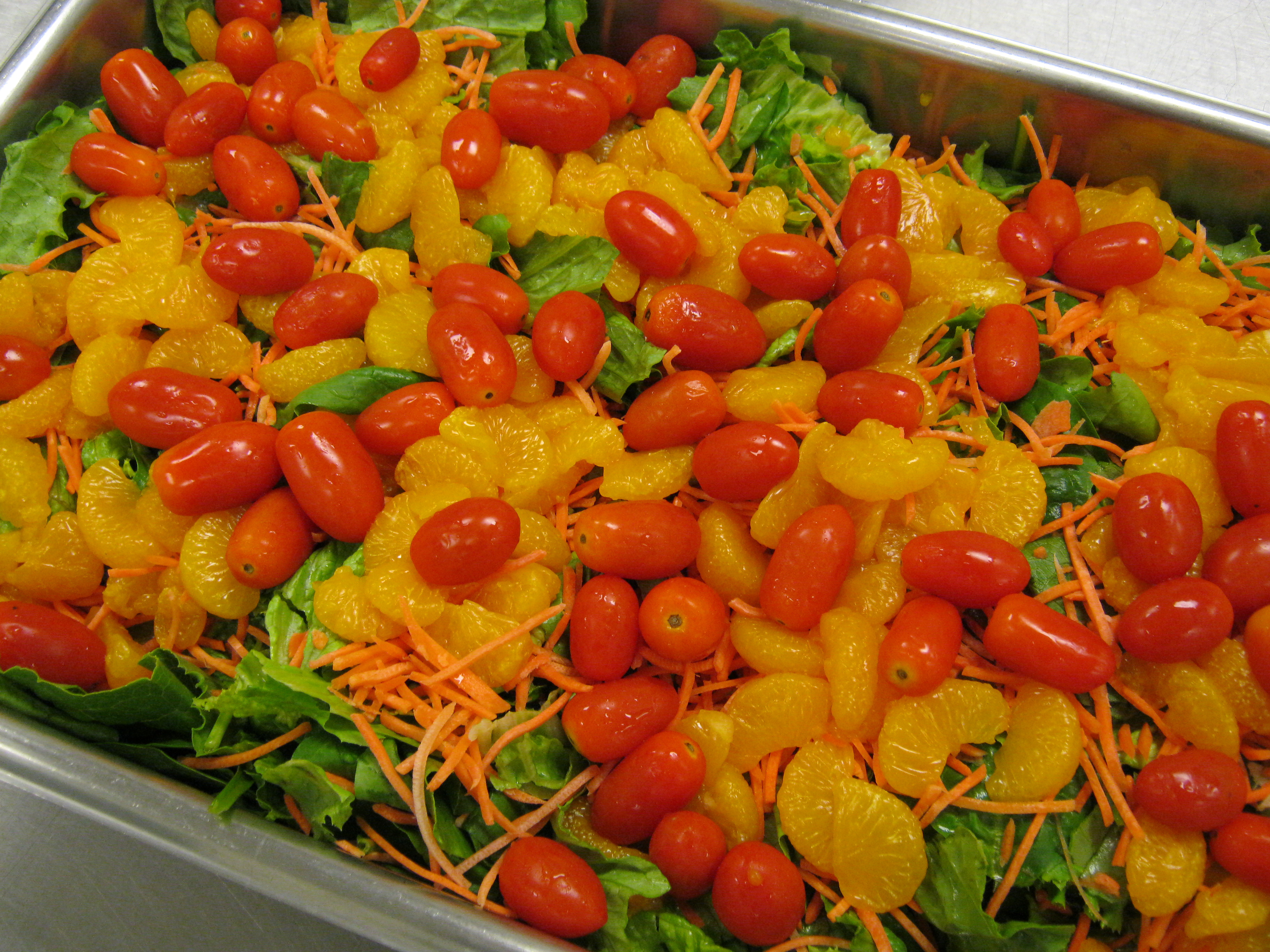 Top with shredded carrots, grape tomatoes and mandarin oranges.