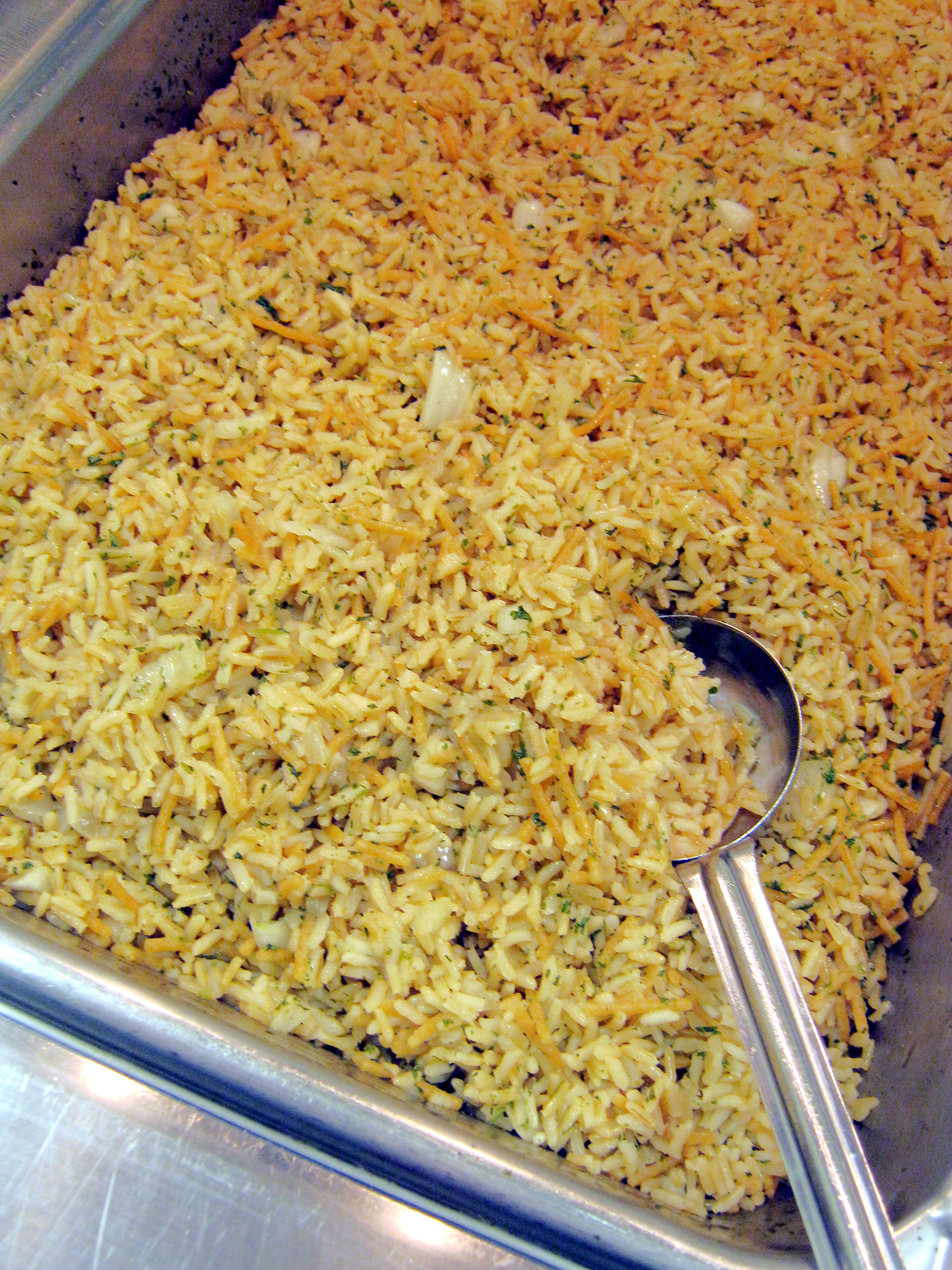 Place 1 lb 9 oz of rice and 3.1 oz of broked dried spaghetti noodles (break into 1/2 - 1 inch pieces) in each steamtable pan, (12" X 20" X 2 1/2"). For 50 servings, use 2 pans.