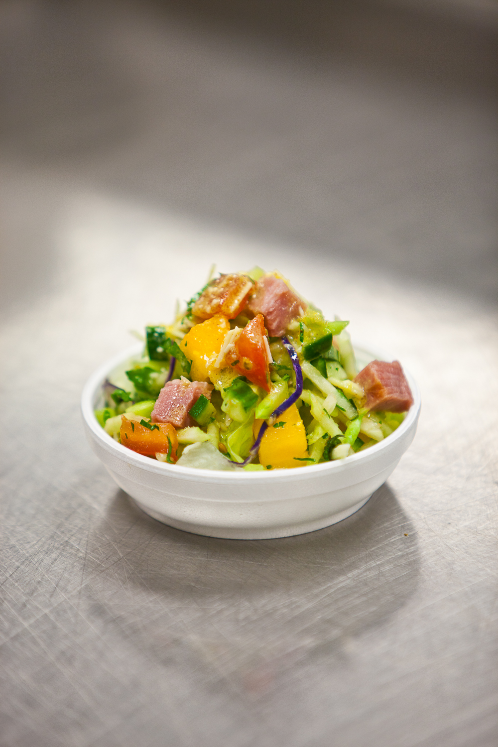In a large bowl combine the broccoli slaw, cucumbers, tomatoes, turkey ham*, basil, parsley and thyme. Mix together evenly. In another mixing bowl combine the orange juice, mustard and cheese and incorporate evenly. Using a whip slowly stream in the oil and emulsify. Season the broccoli salad with salt and pepper and add the dressing to lightly coat it. Serve in the iceberg lettuce cups