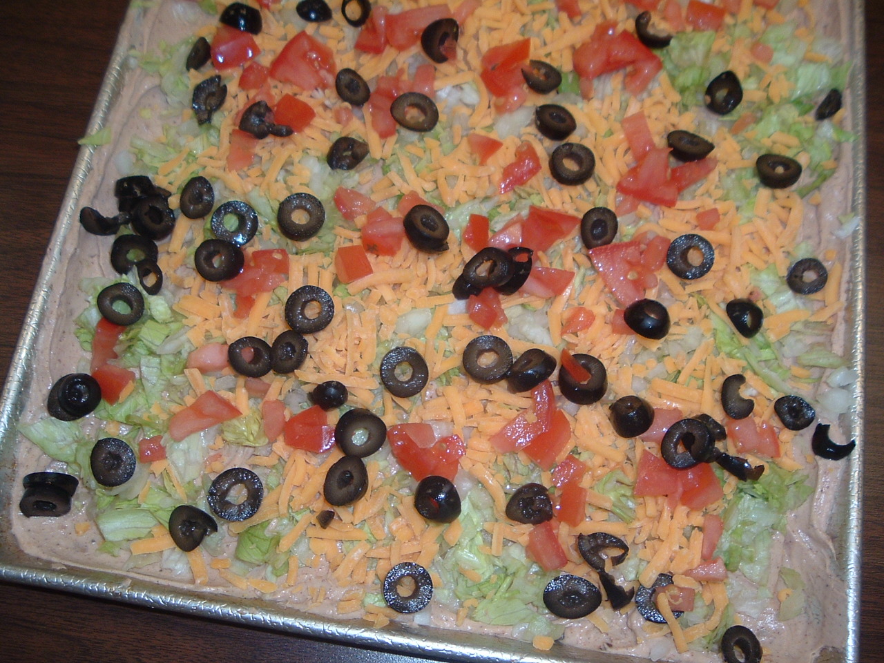 Evenly top with lettuce, tomatoes, onions, olives, and cheese.