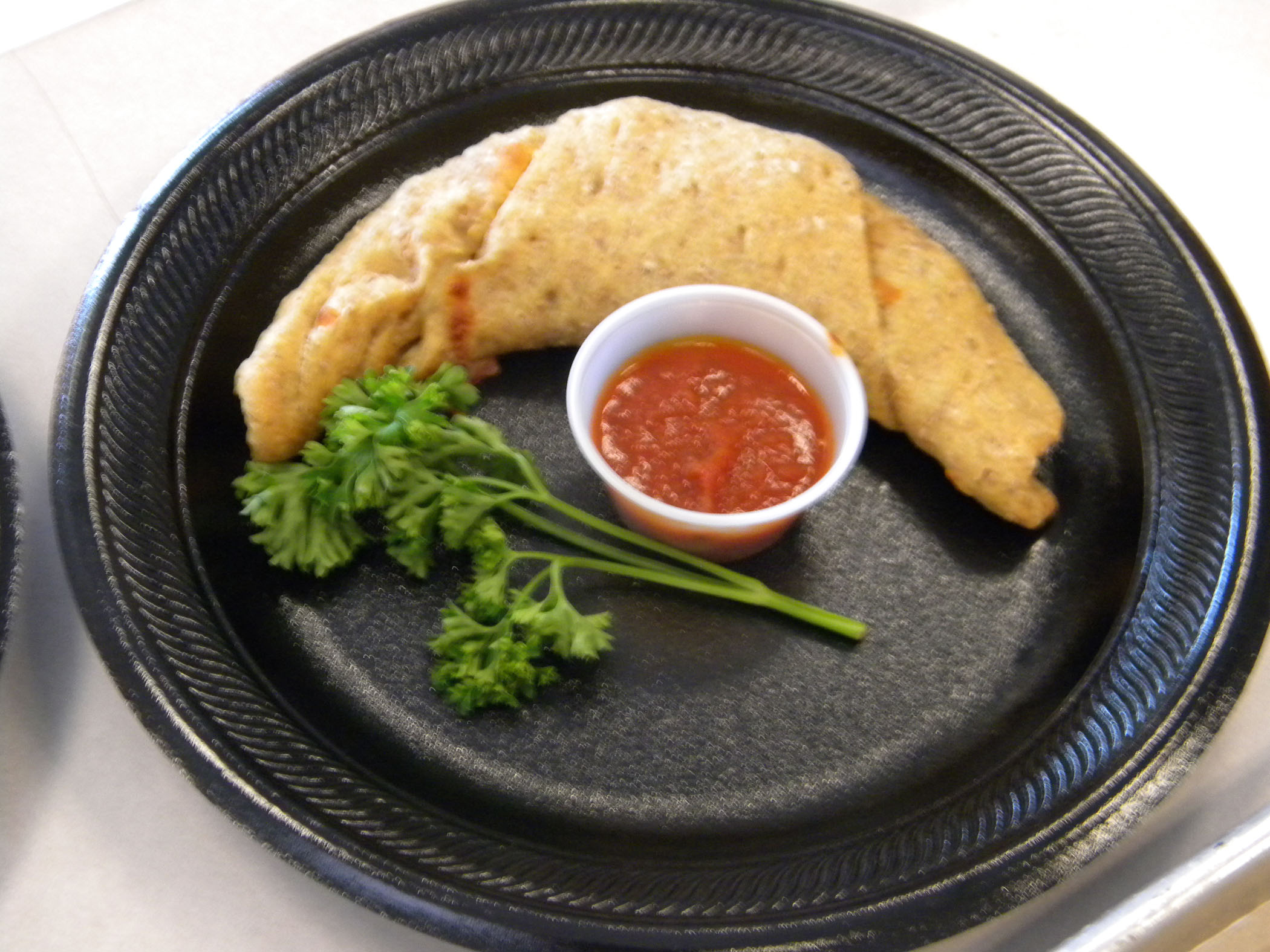 An Italian entrée with shredded Chicken, sautéed onions, broccoli, and mozzarella cheese served in fresh whole grain pizza dough and tomato sauce for dipping.