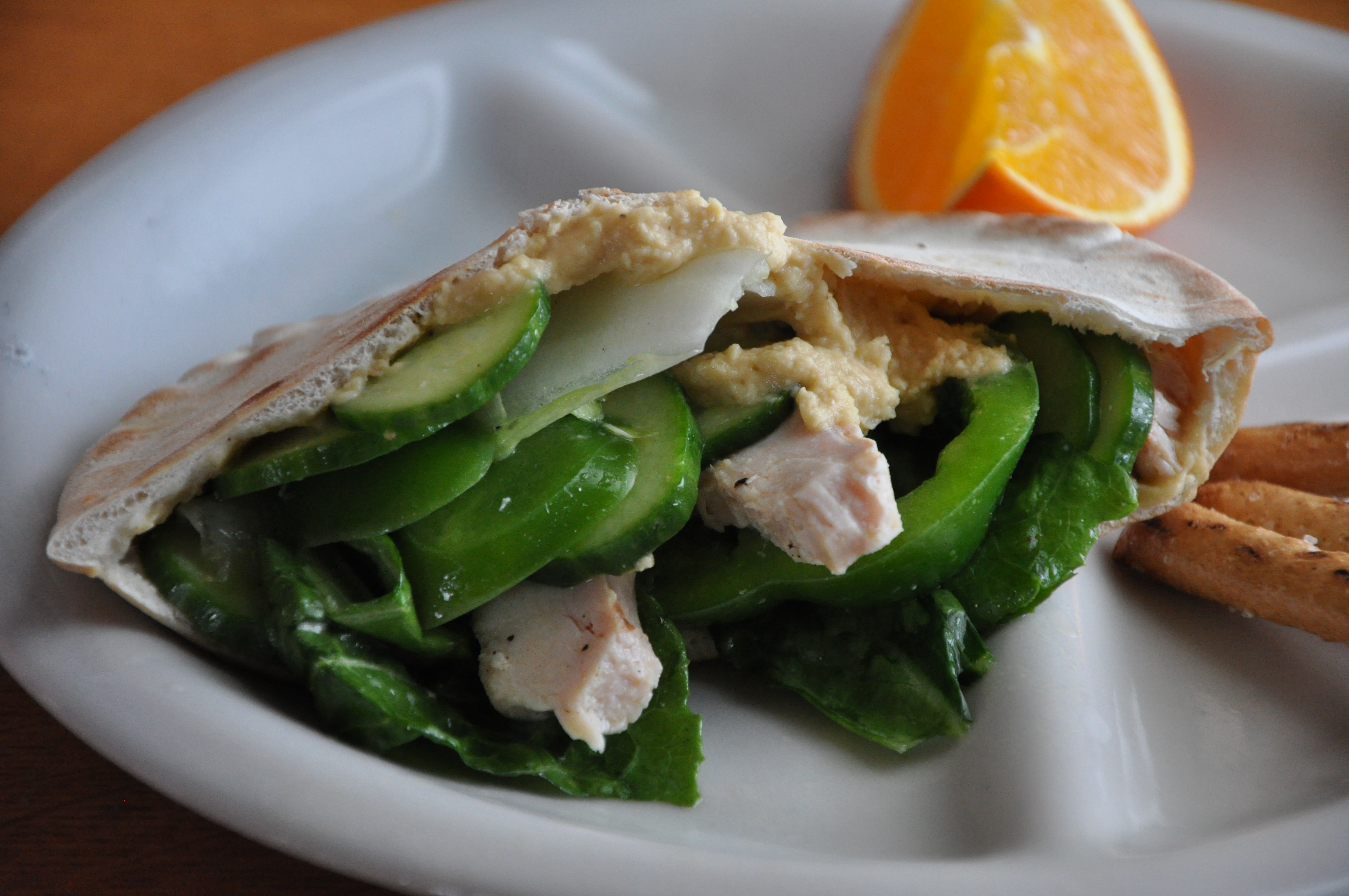 This Mediterranean sandwich is full of flavor and texture. A lightly toasted pita smothered with creamy hummus and filled with crunchy cucumber, crisp bell pepper and juicy pieces of chicken. This main dish sandwich is filling and easy to eat on the go.