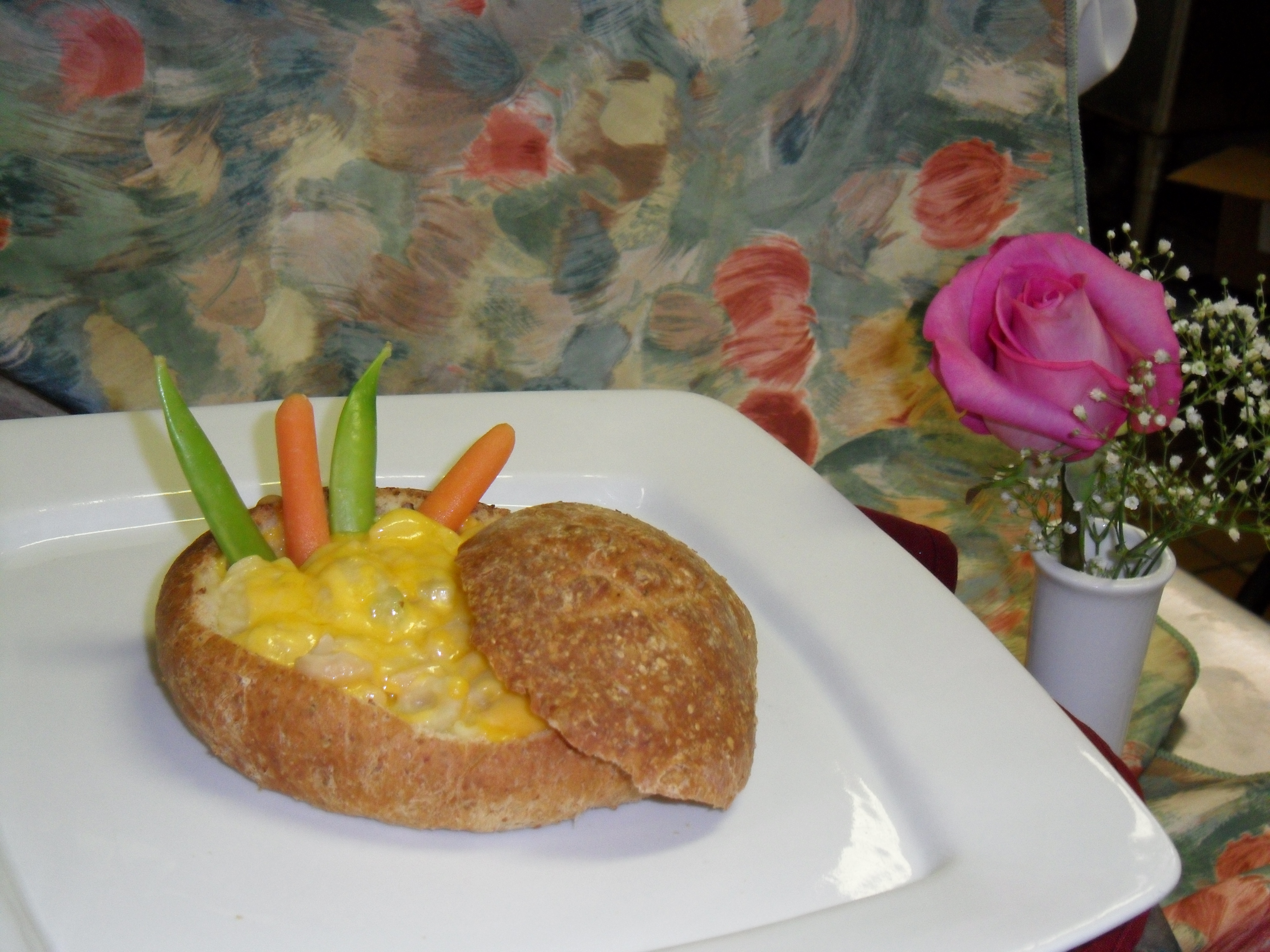A warm crusty stoneground bread bowl filled with Cannelinni bean & shell pasta stew topped with shredded cheddar cheese and garnished with fresh carrot and sugar snap pea pods. Sounds adult but the kids were thrilled.
