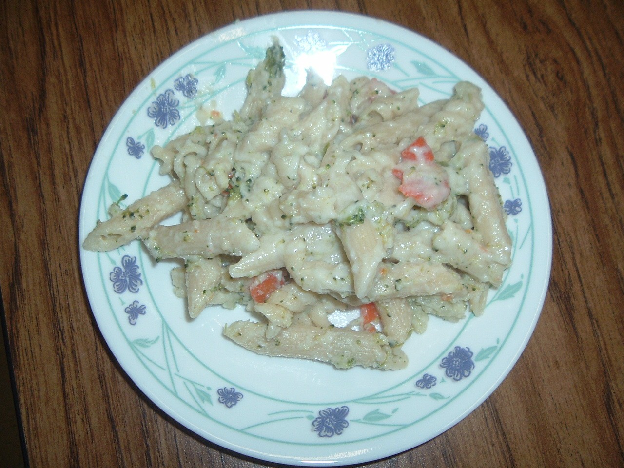 Tender cooked noodles blended with flavorful vegetables in a homemade cheesy alfredo sauce.