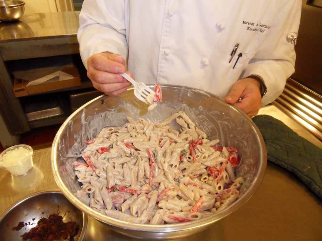 The combination of fragrant herbs and colorful crisp vegetables kicks up the cannellini beans and whole wheat pasta to a delectable level.