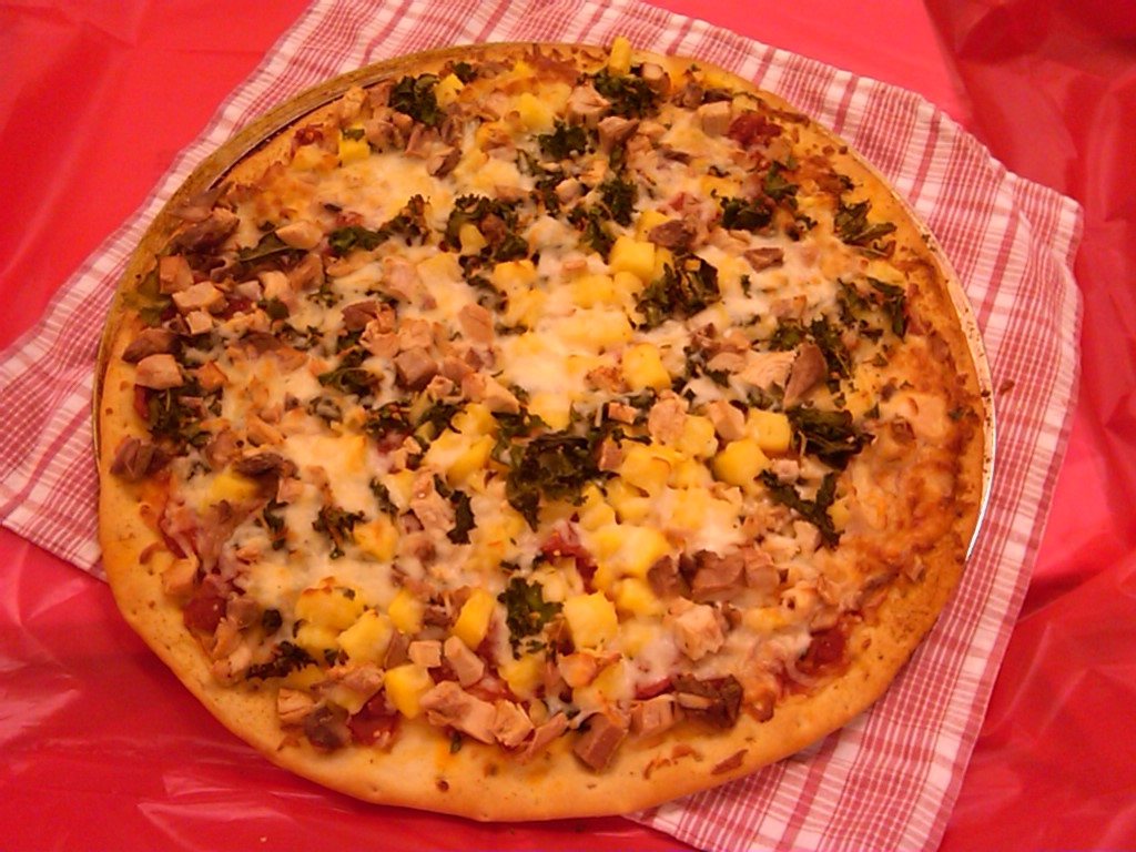 One bite of this Pizza and you will be" Rushing" back for more. This entree has all the flavor of a good tasting pizza and is packed with 2 healthy vegetables, Kale and Sweet potatoes. For those of you who do not favor sweet potatoes you will be pleasantly surprized by the flavor. You will also enjoy the chicken and melted mozzarella cheese on this pizza. MM good!