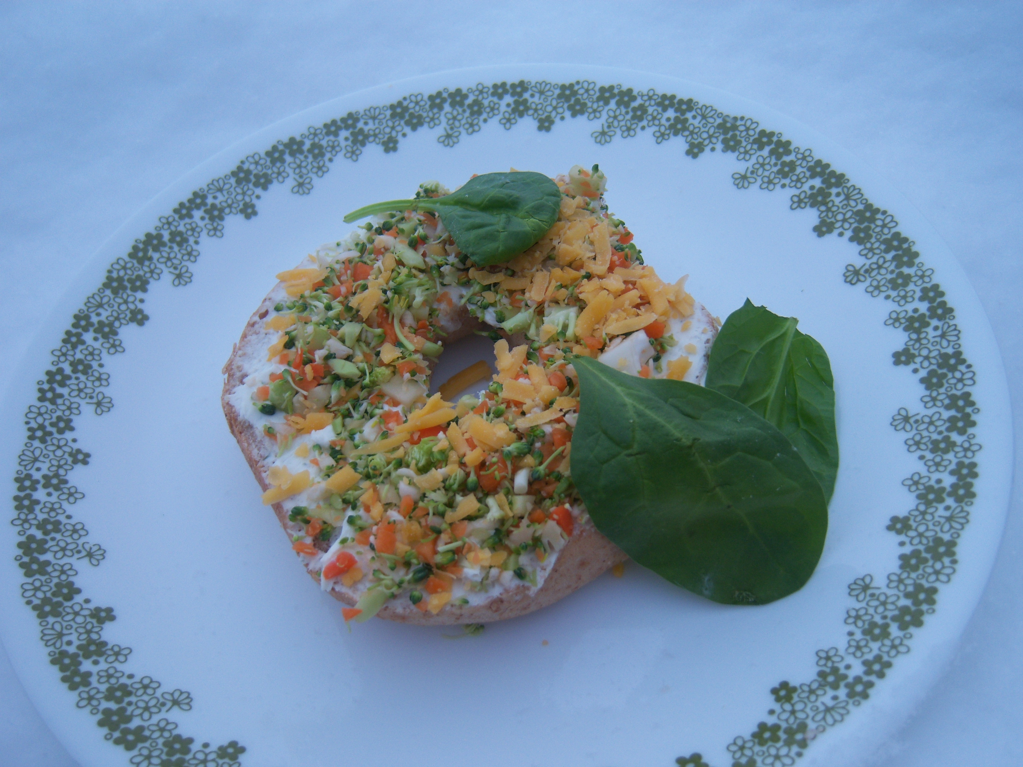 Split whole wheat bagels into halves and lay open-faced on baking sheet. Mix cream cheese with powdered ranch flavoring, then spread on each bagel half. Chop broccoli, cauliflower, and carrots finely and mix together in stainless steel 4" deep prep pan. Sprinkle veggies on top of bagels, then top with 1 T. cheddar cheese.