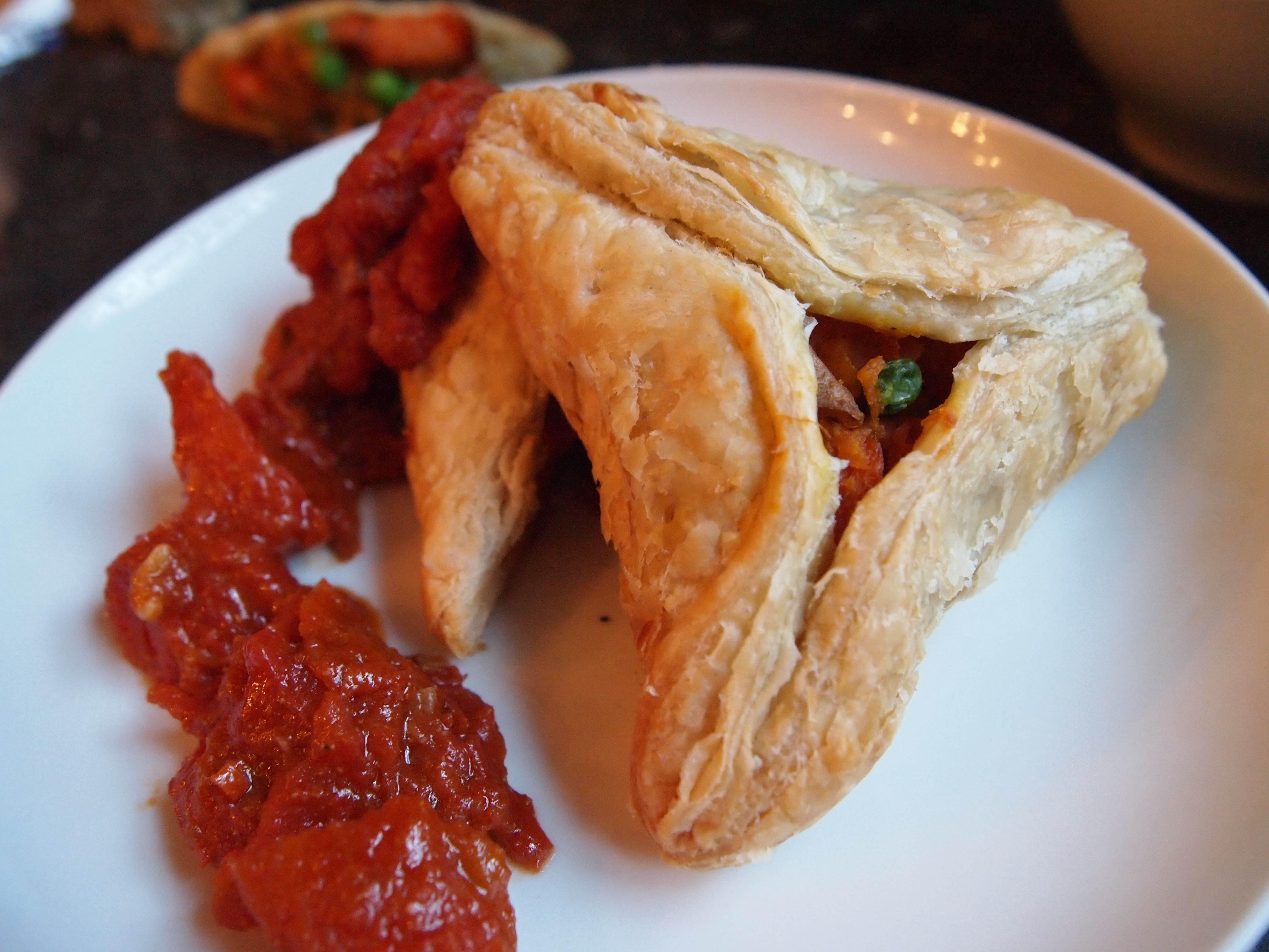Serve 2 samosas with 2 T of the sauce.