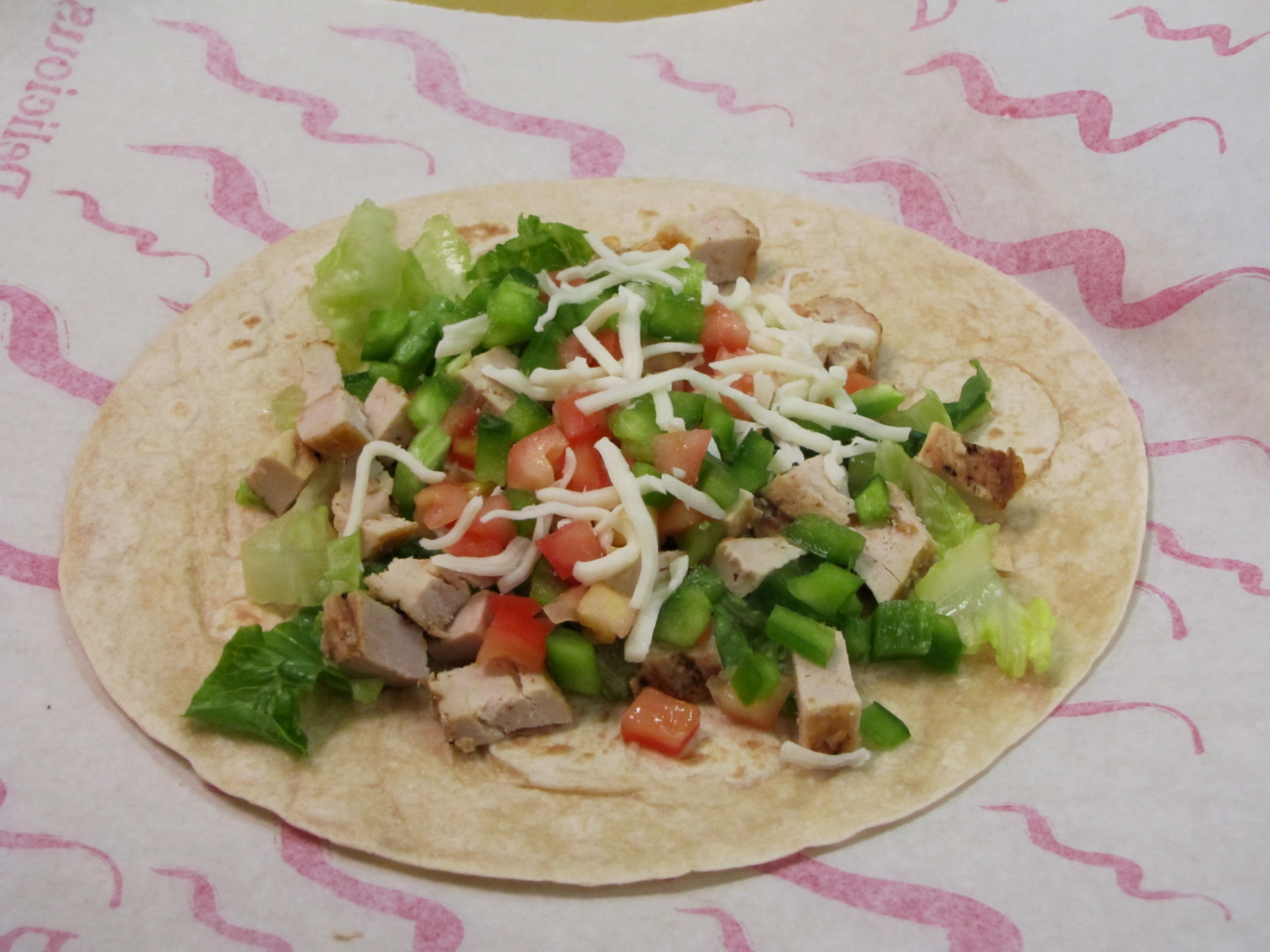 2 oz chicken .25 cup romaine lettuce 1 Tbsp green peppers 3 Tbsp tomatoes Garnish wih .5 Tbsp mozarella cheese