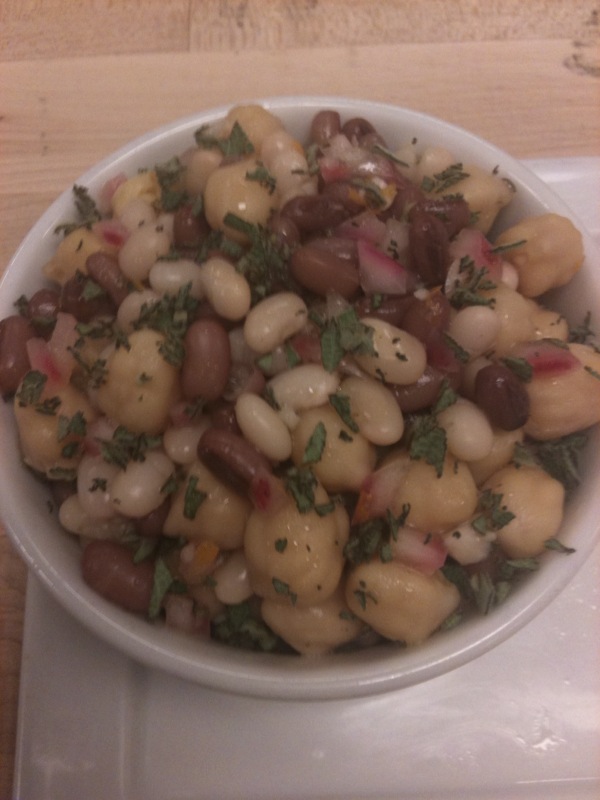 This flavorful twist on an old standard is enhanced with a fragrant citrus dressing. White, red and chick peas are cooked till tender, then bathed in a dressing made with orange and sage. This would be used as a side dish.